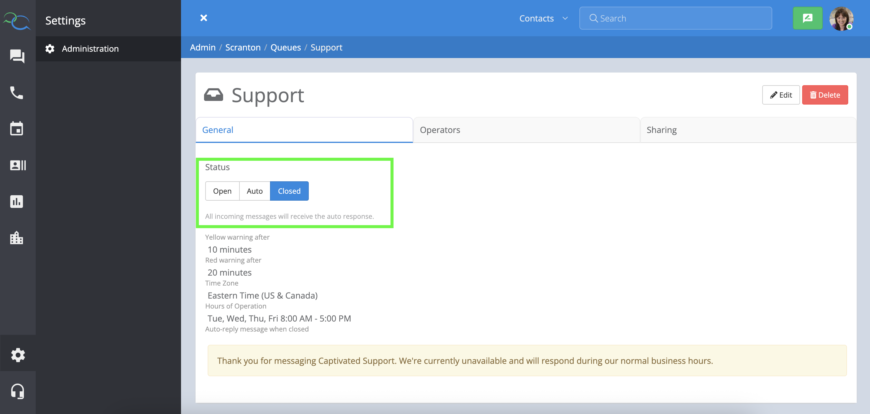 Please Note: When your office opens back up, you will need to toggle the Queue(s) back to Open or Auto and adjust auto-reply accordingly. It does not automatically revert to old settings.