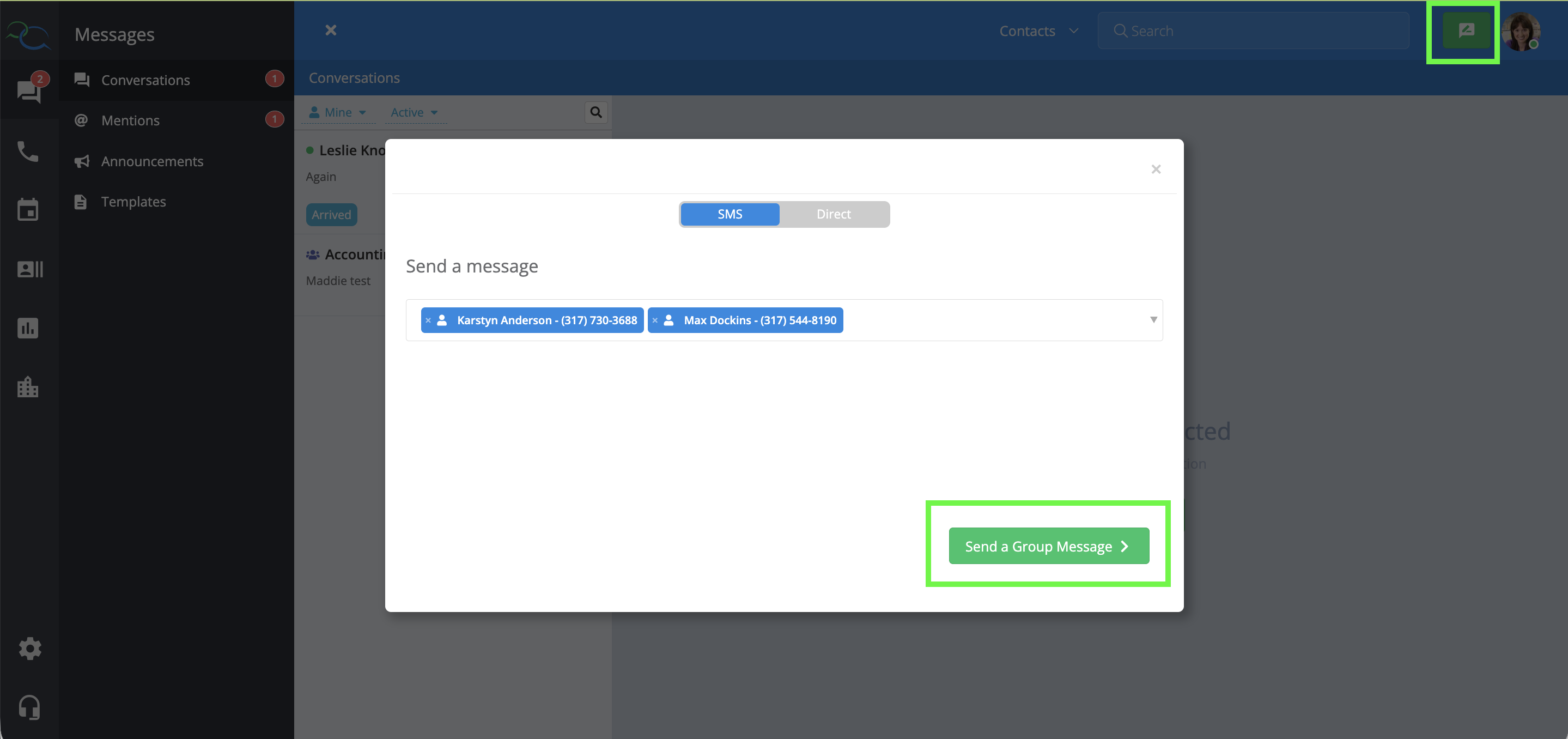 Let’s review how to send a group message from the green new message button. First navigate to the green new message button in the top right-hand corner of your screen. Ensure you are on the SMS option. The group message option will populate once you have selected more than one contact.