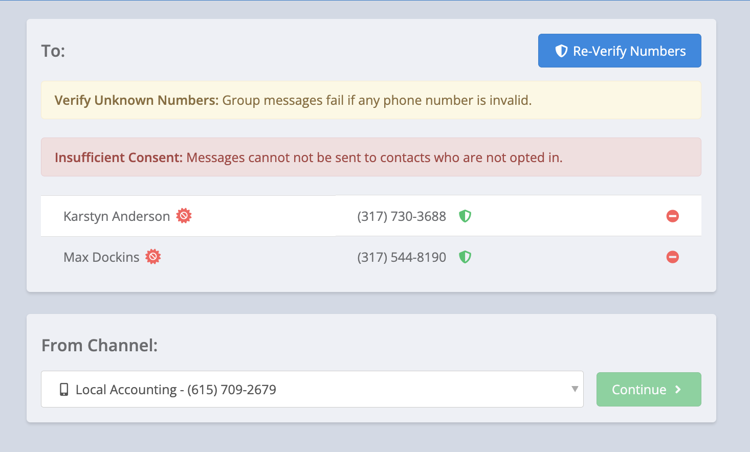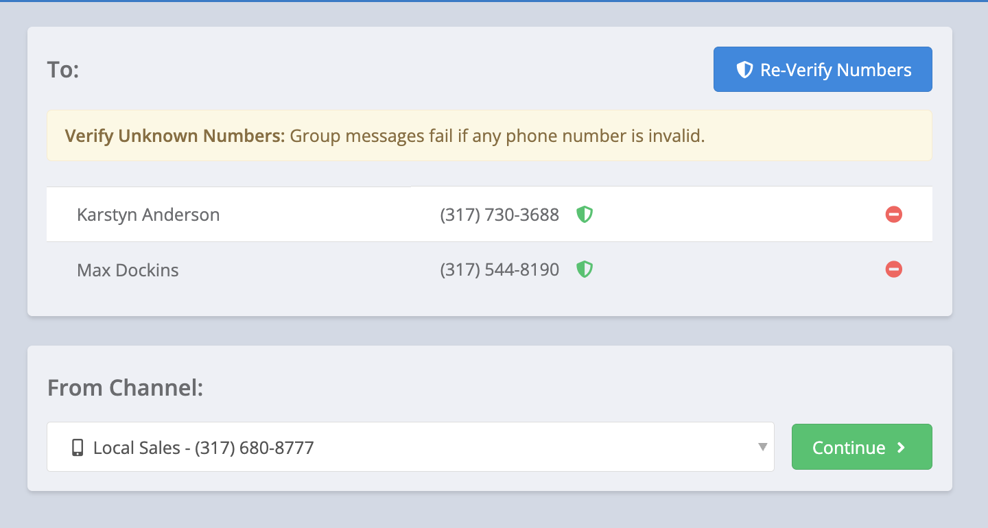 Once all contacts are chosen and opted in, hit continue to send your group message.