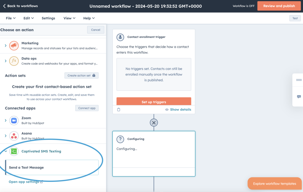 Once you have connected HubSpot and Captivated, you can sucessfully utilize HubSpot Workflows to ‘Send a Message’ via Captivated. It will show up as a workflow action after successfully connecting HubSpot and Captivated.